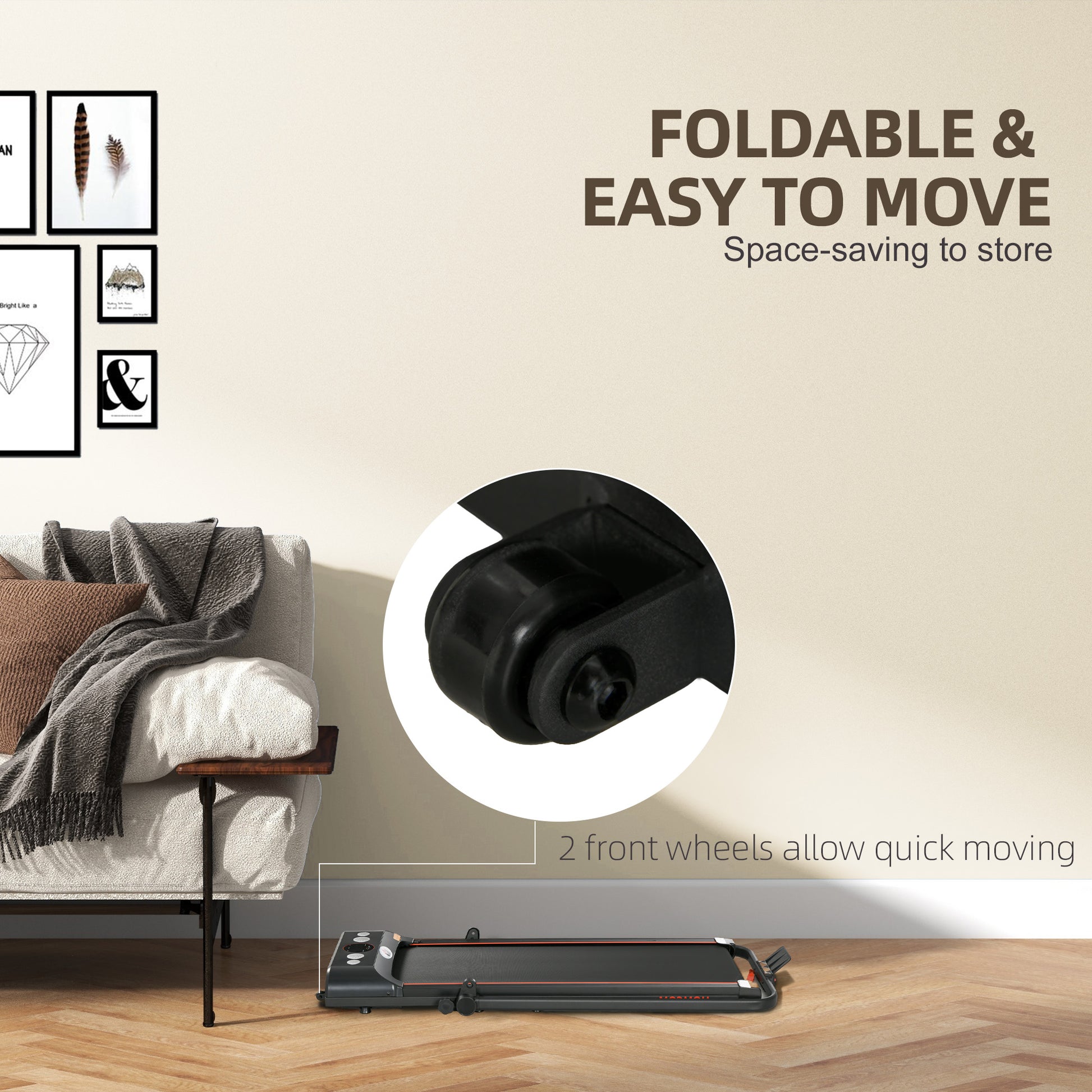 - Portable treadmill: Our folding treadmill features two built-in wheels, making it easy to slide under a sofa, bed, or stand against the wall. When you're done, just fold and store - great for saving space.
